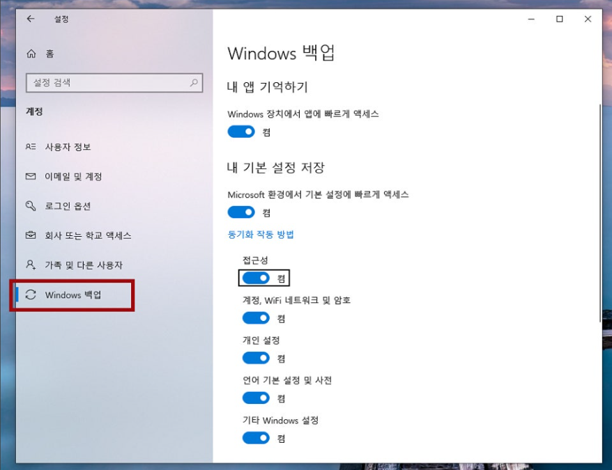 - 'Windows 백업' 항목에서 '설정 동기화' 또는 **'백업 관리'**를 눌러 백업 기능을 켜주세요.